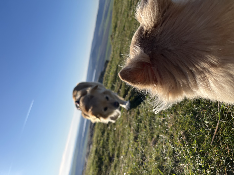 - "A high-angle, eye-level perspective image depicts two light-colored dogs positioned on a sunlit, grassy hillside, with a panoramic landscape in the background, near Razdelna, Bulgaria" by FM-m1kZq2, licensed under CC BY 4.0