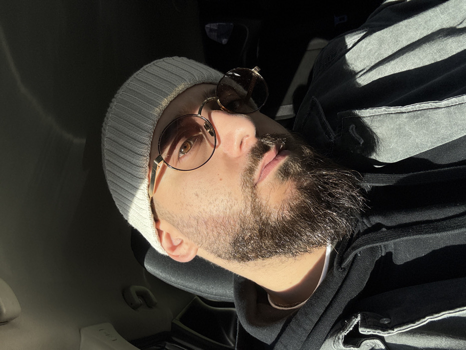 The scene depicts a male individual inside a vehicle in Hérouville-Saint-Clair, France; specific external landmarks are not visible. The subject, positioned centrally, is observed from a slightly low angle. He has a beard and mustache, and is wearing a light grey ribbed knit beanie. Round, gold-rimmed sunglasses with dark lenses are worn, with the right lens flipped upward, revealing a light brown eye. He wears a dark-colored hooded sweatshirt underneath a faded grey or black denim-style jacket. A thin, light-colored necklace is visible. Direct sunlight from the left illuminates the left side of his face and parts of his clothing, creating strong highlights and casting the right side of his face and the vehicle's interior into deep shadow. A dark-colored car seat headrest is visible behind him. No other individuals or significant actions are observed.