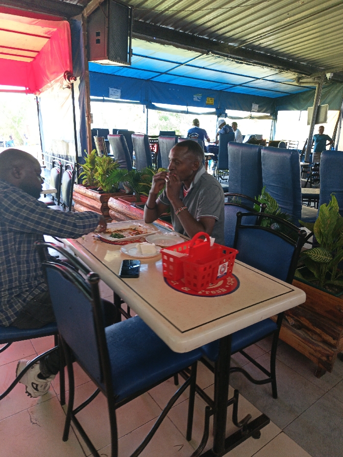 The image depicts a semi-enclosed outdoor dining area within a restaurant in Athi River ward, Kenya