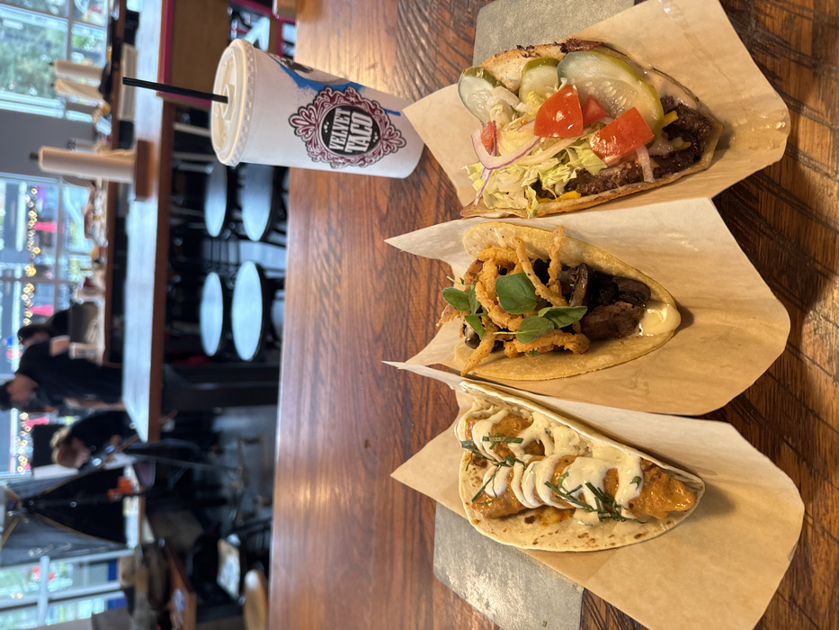 Three tacos are presented on brown paper atop a wooden table. The top taco has tomatoes, pickles, lettuce, and thinly sliced red onions. The middle taco contains meat, herbs, and fried onion strings. The bottom taco has creamy sauce and is sprinkled with green herbs. A large cup from Velvet Taco with a black straw sits to the left. The background shows a window, a dish rack, and people.