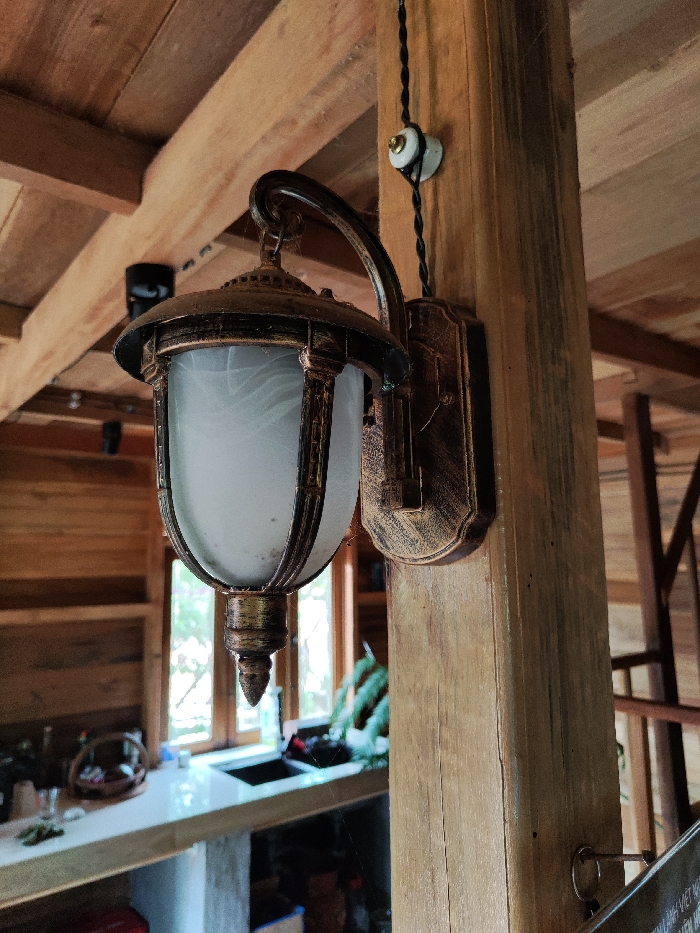 The image depicts an interior scene in Lán Tranh, Vietnam, featuring a rustic architectural style with exposed wooden elements. A decorative wall-mounted lantern, styled with an aged bronze finish and an oval, frosted glass shade with subtle patterns, is affixed to a vertical light-brown wooden post. A twisted black electrical wire is visible running vertically down the post, secured by a white ceramic insulator, and connecting to the lantern's mounting plate. The ceiling above consists of exposed wooden planks and beams, with two black spotlights mounted on one of the overhead beams. In the background, multiple wooden-framed windows provide natural light and a view of green outdoor foliage. Below the windows, a light-colored countertop with an integrated dark square sink is visible. Miscellaneous items, including a small wicker basket and several bottles, are partially seen on the counter, and a large green leafy plant is situated near the sink area. No individuals, specific actions, or interactions are present in the scene.