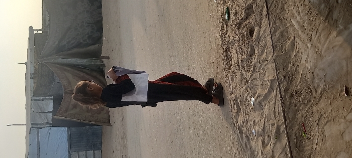 - "A young individual, likely a girl, with light brown hair in a high ponytail and wearing glasses, walks across an unpaved, sandy path in Khan Yunis, Palestinian Territory" by FM-INiU52, licensed under CC BY 4.0