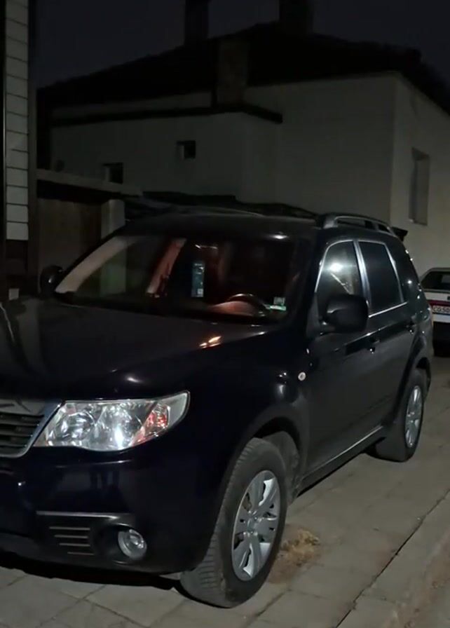 A dark-colored Subaru Forester is parked on the side of a street at night. A house is in the background, and the car's headlights are on. There are no people visible in the video.