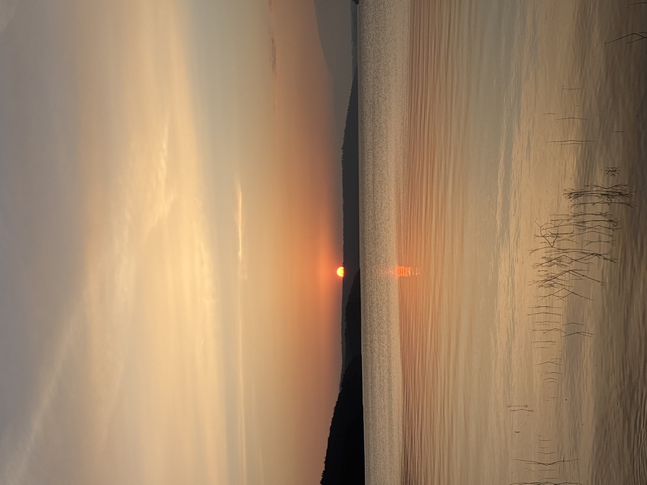 The image displays a sunset scene over Koprinka Reservoir in Koprinka, Bulgaria. The sky occupies the upper two-thirds of the frame, showing a gradient of warm tones from pale orange-yellow near the horizon to a muted grey-blue at the top, with faint, elongated cloud formations. A bright, semi-circular orange-red sun is positioned low on the horizon, partially obscured by a distant, dark, undulating landmass, likely hills or mountains. The surface of the reservoir is relatively calm, reflecting the sky's colors and exhibiting a prominent vertical streak of direct orange-red sunlight beneath the sun. Subtle ripples are visible across the water. In the immediate foreground, a cluster of thin, leafless plant stalks protrudes vertically from the water, their reflections also discernible on the surface. No human figures, animals, or man-made structures are visible within the scene.
