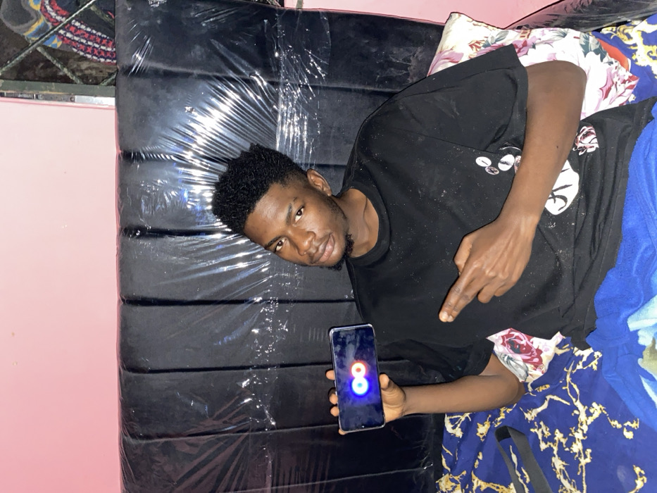 This image depicts an adult male seated in an indoor setting within the city of Udu, Nigeria. The individual, appearing to be in his early twenties, has dark skin, short dark curly hair, and a trimmed beard. He is wearing a black short-sleeved t-shirt with white graphic designs on the front and blue lower garments. The man is looking directly at the camera with a neutral expression. He holds a black smartphone horizontally in his left hand, displaying a screen with two glowing, interconnected circular icons: one blue and one red-orange. His right hand is raised, with the index finger extended forward. The background features a dark, vertically segmented upholstered headboard, covered in clear plastic sheeting, situated against a light pink wall. A dark blue patterned sheet and a floral-patterned pillow are visible on the bed. The upper right corner of the image shows a partial view of a dark, indistinct area, possibly a window or cluttered space.