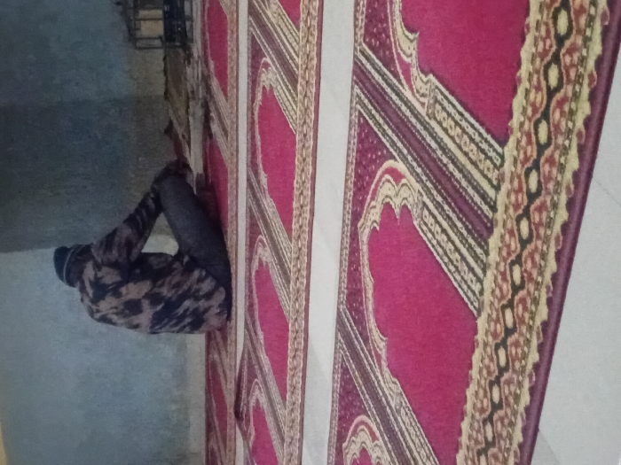 A person wearing dark clothing and a hat sits on a red and patterned carpet. The carpet has an arch motif and is divided into sections by white lines. The person is positioned to the left of the carpet. The background consists of a light-colored wall and floor. A chair or other structure is visible at the top of the image.
