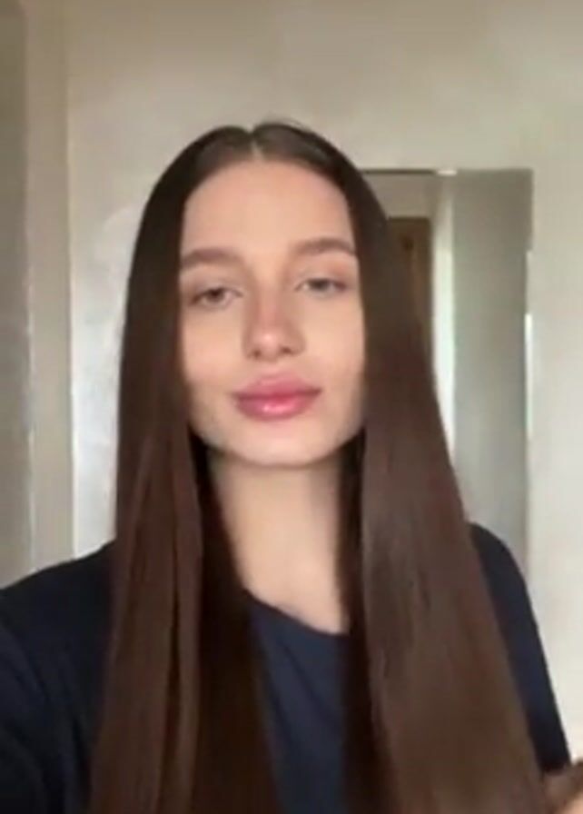 A woman with long, straight, dark brown hair, wearing a navy blue t-shirt with white lettering and design on the front, stands in front of a beige wall. She has fair skin, blue eyes, and glossy pink lips. She puckers her lips, as if blowing a kiss, and then sticks out her tongue briefly. Behind her, to the right, is a mirror that reflects a doorway. The video is shot from a slightly low angle. The lighting appears to be natural daylight.