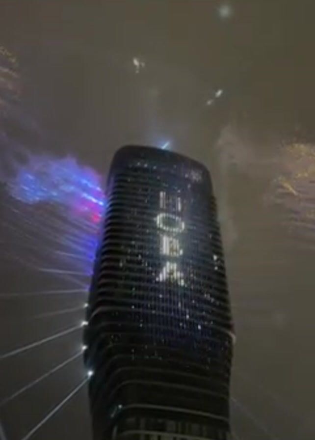 A tall building is illuminated with a light show. The building is modern, with a curved design. The word "HOBA" appears in lights on the building, then changes to "2024". The sky above the building is dark with fireworks going off. There are also bright lasers shining out from the building. The scene is festive and celebratory.