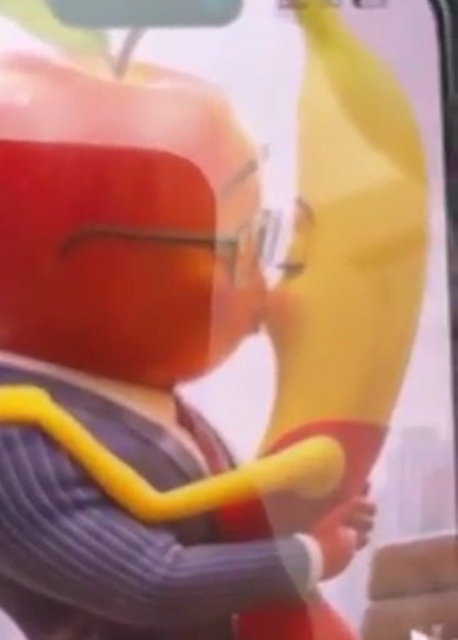A close-up shows a cell phone displaying a cartoon image of an apple-headed man with glasses and wearing a suit, kissing a banana character wearing red underwear
