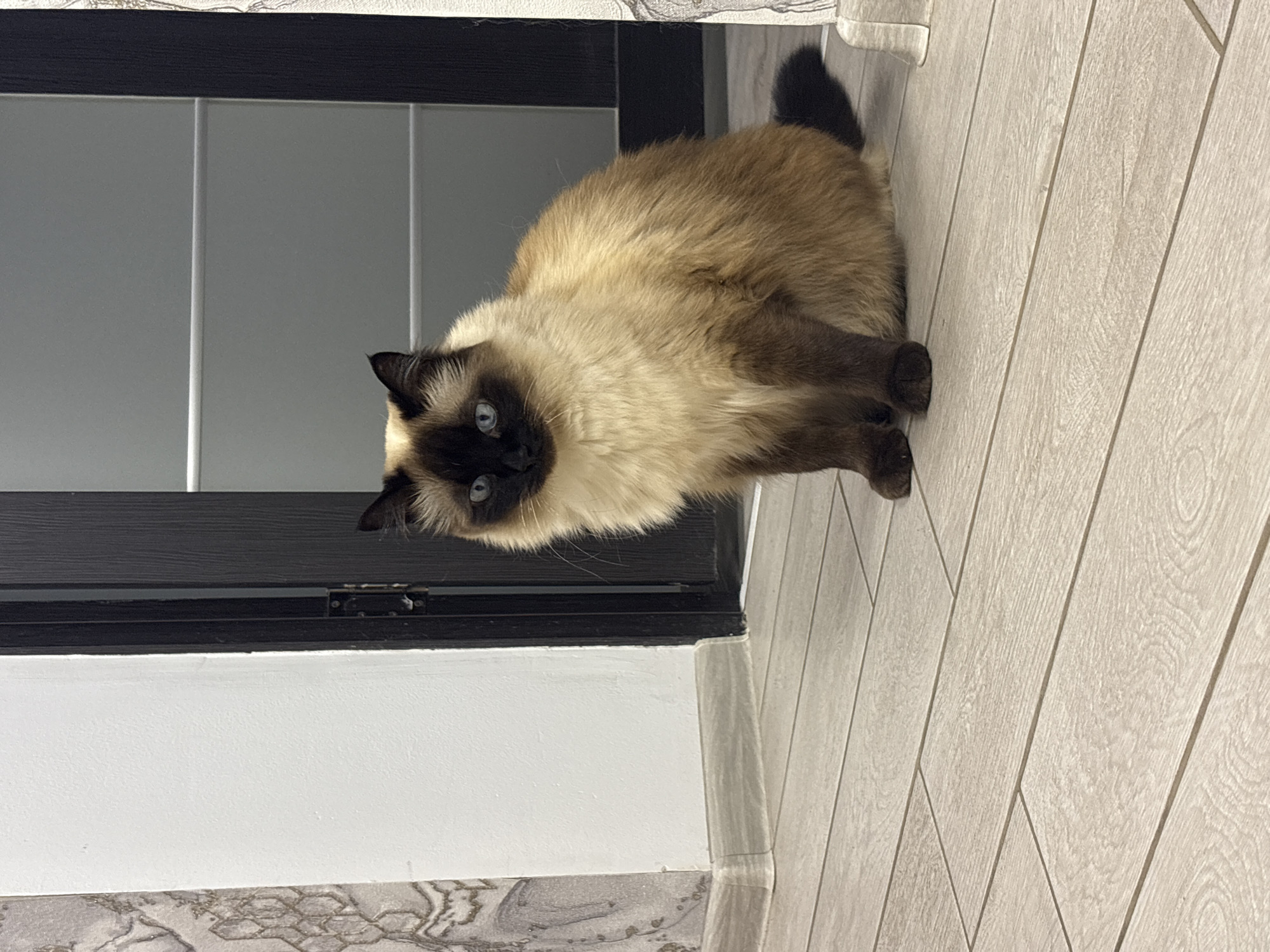 A Balinese cat stands on light wood-look tile flooring. The cat has a light tan body and a dark brown face, ears, legs, and tail, and bright blue eyes. The cat is facing the camera. To the left, a doorway with a dark frame and white panel is visible, along with a white wall above a section of decorative grey patterned tiling along the base. The photo appears to have been taken indoors. The location is not discernible based on the image alone; no information regarding Simferopol, Ukraine, can be determined from this image.