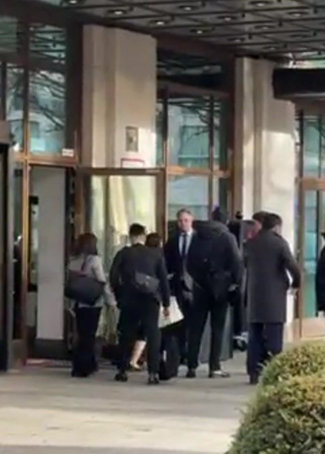 A group of about 10 people is exiting a building, identified as a hotel due to the revolving doors and signage on the building. Most of the group is dressed in dark suits or dark jackets, and they are standing on a sidewalk near some greenery. Some of the individuals are carrying luggage or bags. The overall scene appears to be outdoors during daylight hours.