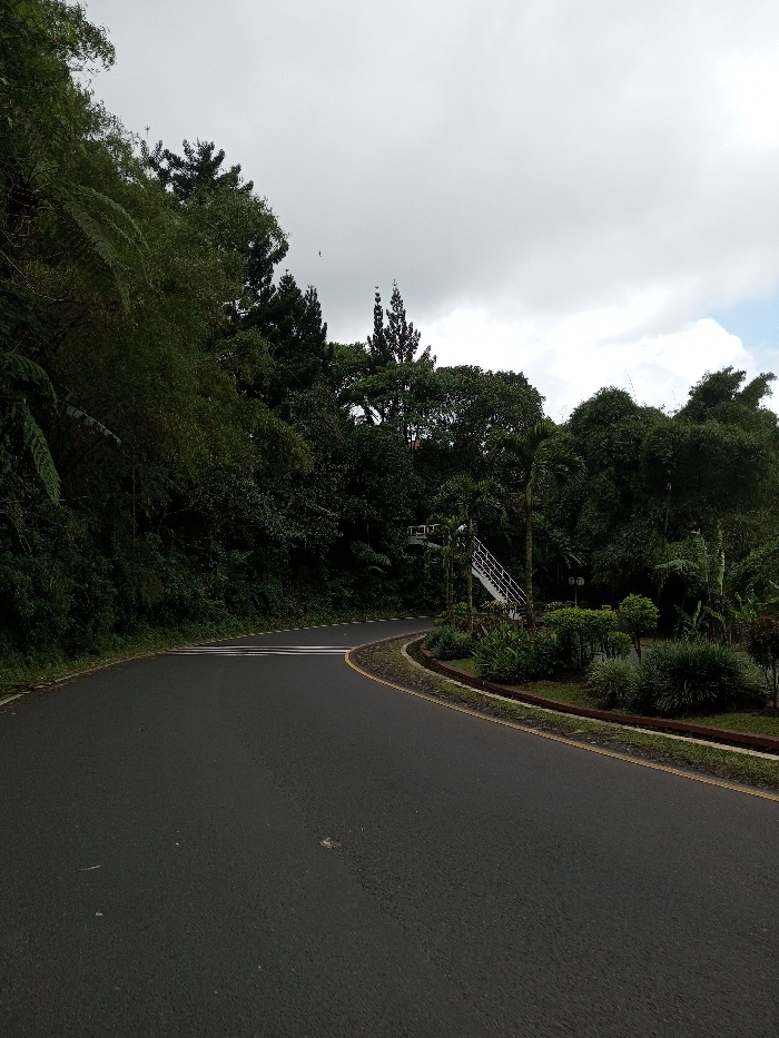 The image depicts a paved asphalt road curving to the right through a verdant landscape in the city of Boommlog, Bhutan. The road surface is dark grey, with a solid yellow line delineating its right edge, separating it from a narrow concrete curb and a landscaped median strip. The left side of the road is bordered by a densely forested hillside covered in various green foliage, including ferns, bamboo, and broadleaf trees. On the right side, beyond the median, is a manicured area featuring bushes, smaller plants, and palm trees. Further back on the right, partially visible amidst the trees, is a white multi-level structure with railings, appearing to be a pedestrian bridge or staircase. The sky above is overcast with light grey clouds. No people or vehicles are present in the scene.