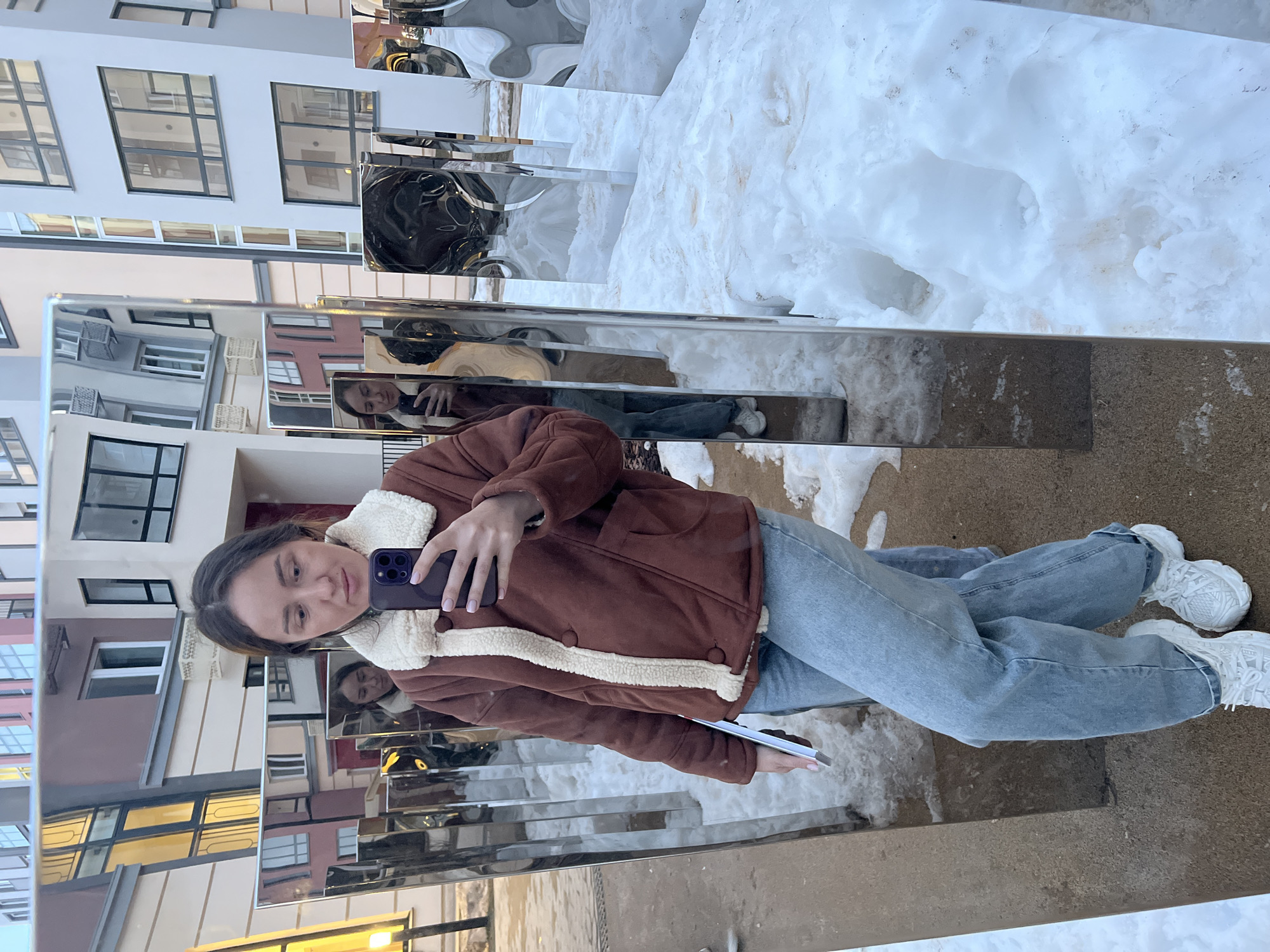 young woman taking a selfie in Chemoshur, Russia. She is standing in front of a mirrored installation, which reflects the surrounding urban landscape including buildings, snow piles, and other passersby. The woman is wearing a brown jacket with a white furry collar, light blue jeans, and white sneakers. She is holding a smartphone in her right hand, presumably to take the picture. In her left hand, she is holding a white flat object. The ground appears to be a mix of pavement and areas covered in snow. The reflections in the mirrored surfaces create multiple distorted images of the woman and the cityscape.