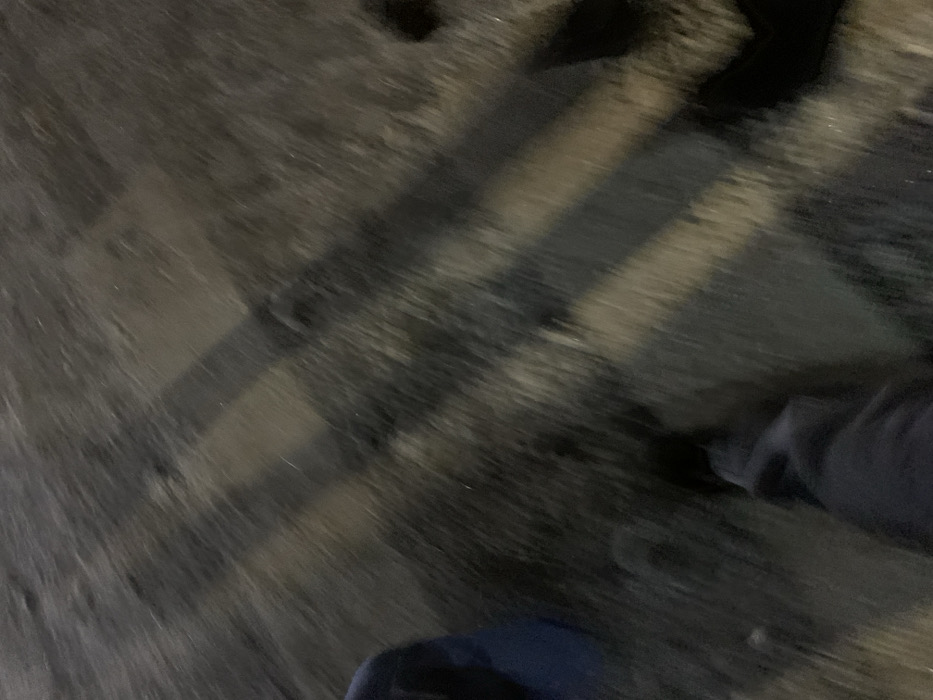 The image captures a blurry, low-lit scene dominated by dark, streaked textures resembling wood grain. Diagonal lines suggest movement or the presence of shadows. A hint of blue fabric appears in the bottom portion of the frame, possibly clothing. The overall impression is one of indistinct patterns and murky lighting, making it challenging to identify specific objects or details.