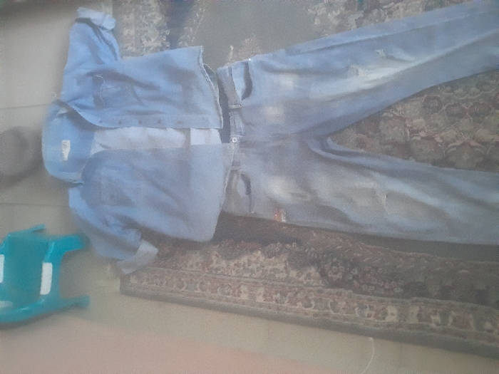 The scene in Gayawa, Nigeria, depicts a casual outfit laid flat on a patterned rug. The ensemble consists of a light blue denim long-sleeve shirt, with its sleeves rolled up, unbuttoned to reveal a white undershirt beneath. Positioned directly below the shirt is a pair of light blue distressed denim jeans, exhibiting visible rips and wear marks. To the upper left of the clothing, a small, light blue plastic stool rests on a light-colored floor, partially visible around the edge of the rug. No individuals are present in the image, and no actions or interactions are depicted.