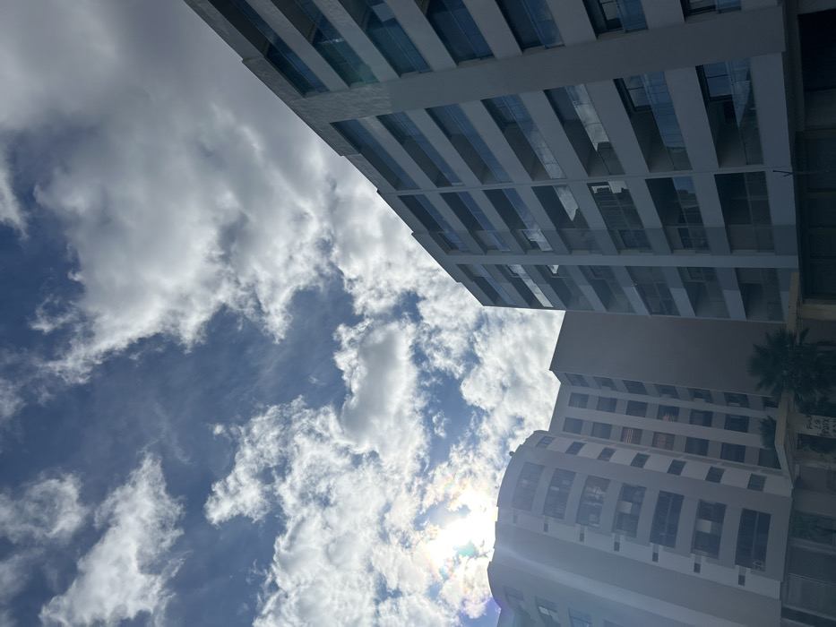 The image depicts a modern urban environment in Fez, Morocco, under a partially cloudy blue sky. The scene is dominated by contemporary multi-story residential buildings viewed from a low angle, looking upwards. The sky occupies the upper two-thirds of the frame, featuring scattered white cumulus clouds against a bright blue background. The sun is positioned in the upper-left quadrant, emitting a strong glare and producing lens flare that casts spectral effects across the sky and the adjacent building. Two prominent, light-colored apartment buildings frame the lower and mid-sections of the image. The building on the right is rectilinear, composed of multiple floors, each featuring balconies equipped with clear glass railings and dark-framed windows or sliding doors. Its facade appears to be light gray or off-white. To the left, a second multi-story building with a subtly curved or rounded facade is visible, also featuring balconies, though its details are partially obscured by sun glare. A third, plainer multi-story building is situated between and behind these two primary structures. At ground level, sparse green foliage, possibly small palm trees or bushes, is visible near the base of the buildings. A low wall or structural element at the base of the left building displays faint, illegible text or graffiti. No individuals, vehicles, or explicit human activities are present in the frame. The overall impression is of a quiet, modern residential or commercial district.