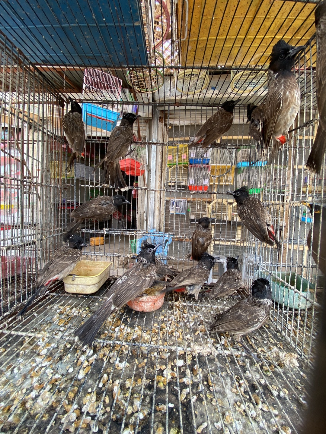 This image shows a densely populated wire birdcage within a market stall in Kandahar, Afghanistan. Approximately 15 to 20 Red-vented Bulbuls (*Pycnonotus cafer*), identifiable by their dark crests and brown-grey plumage, occupy the cage. Several birds are perched on internal horizontal wires, while others rest on the soiled wire grid floor, which is covered with numerous droppings and scattered feed. A beige rectangular dish and a reddish-brown circular bowl are present on the cage floor, likely for food or water. The background reveals additional colorful birdcages and elements of a market structure, including a blue and yellow corrugated roof or canopy. No human figures are visible.