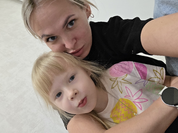 The image displays an adult female and a young girl in a close-up, indoor setting. The background consists of a plain, light-colored, textured wall. The adult female, characterized by short blonde hair, blue eyes, and enhanced eyelashes/eyebrows, wears a black long-sleeved top and blue denim trousers. A small hoop earring is visible in her right ear. She has a slight pout and looks directly at the camera, her head tilted. The young girl, with long blonde hair and bangs, wears a white t-shirt adorned with yellow and pink pineapple and green leaf designs. A thin silver-colored chain is visible around her neck, and a white smartwatch with a black circular face is on her left wrist. She also displays a slight pout and looks directly at the camera, leaning into the adult. The adult's right arm is partially visible, positioned as if embracing the girl. The specific location within the city of Chaikovsky, Russia, cannot be determined from the visual evidence.