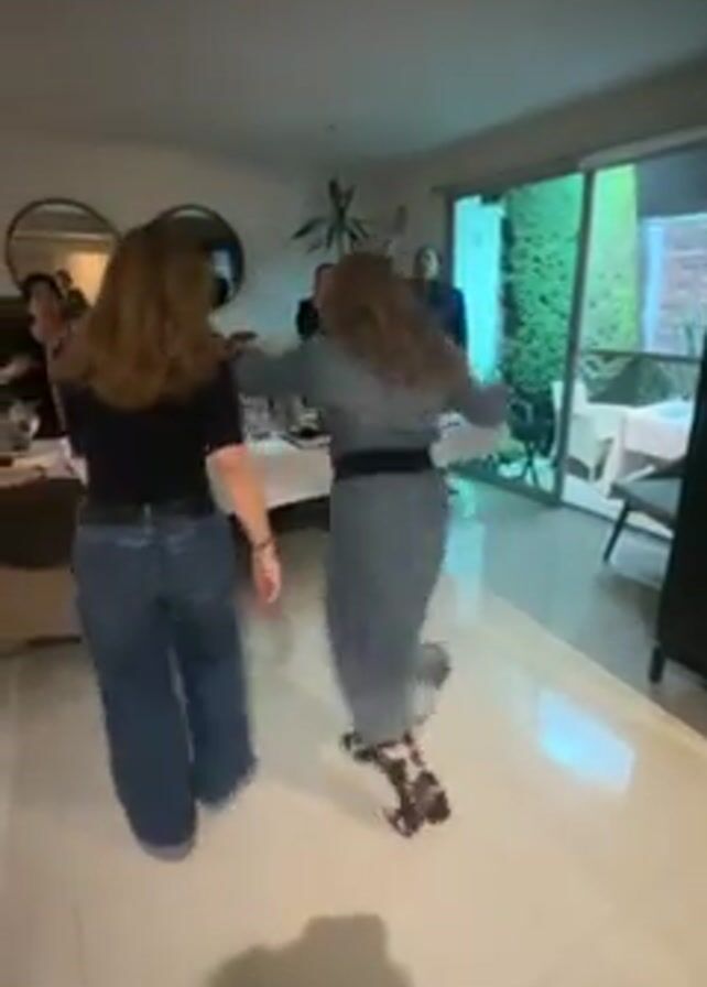 two women dancing in a room. The woman on the left wears a black top and wide-leg blue jeans, while the woman on the right is in a denim jumpsuit with patterned boots. They move around a table set for a meal, where several people are seated and appear to be enjoying the music. A man at the head of the table stands and raises his arms in the air in apparent excitement. A young boy also makes an appearance, observing the scene. The room features white tile flooring, a large window revealing a backyard area, and decorative mirrors on the wall.