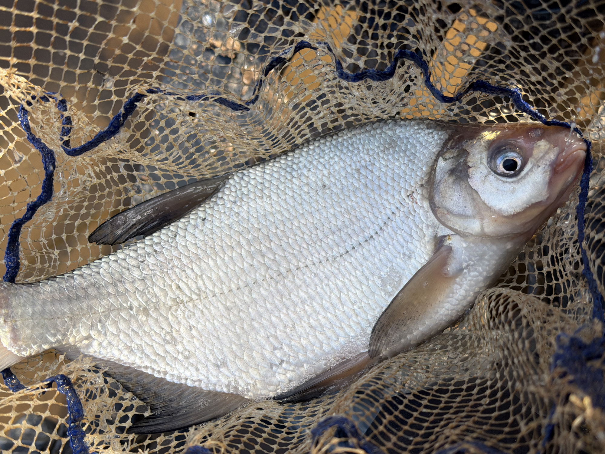 A silver-scaled fish lies in a beige mesh fishing net with a blue cord trim