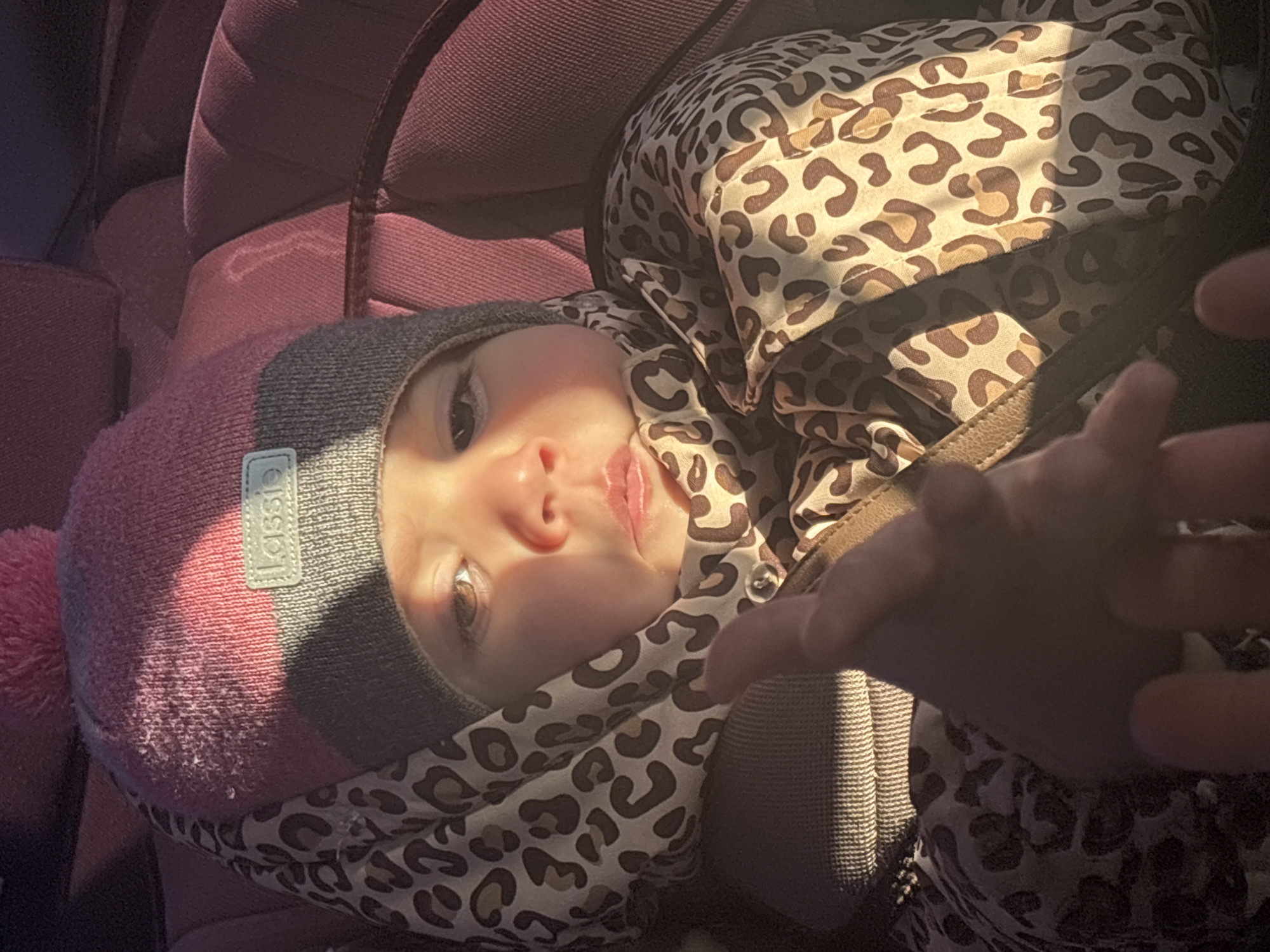 An image taken from a slightly elevated, eye-level perspective depicts a young child seated, partially illuminated by direct, warm light. The specific location within the city of Chaikovsky, Russia, cannot be determined from the visual information provided. The child, appearing to be an infant or toddler, occupies the central foreground, looking directly towards the camera. The visible portion of the child's face shows light skin, brown eyes, and slightly parted lips. The right side of the child's face and clothing is strongly lit, while the left side is in shadow. The child is wearing a knitted hat that is pink at the top with a pink pom-pom, transitioning to grey around the ears and forehead. A light grey rectangular brand tag, bearing the word "Lassie" in white text, is visible on the front-right side of the hat. The child's body is covered by a garment or blanket featuring a leopard print pattern in shades of brown, beige, and cream, suggesting a warm layer. A brown, textured strap, consistent with a car seat or stroller harness, is visible across the child's chest. Buttons are present on the leopard-print material near the child's neck. In the lower-middle foreground, a human hand, possibly an adult's, is partially visible and out of focus. The hand is positioned to the right of the child's chest, with fingers slightly extended towards the child. The background consists of maroon-colored, upholstered material, consistent with a car seat or vehicle interior. Strong directional light, likely sunlight, originates from the left side of the frame, creating distinct highlights and shadows across the scene.