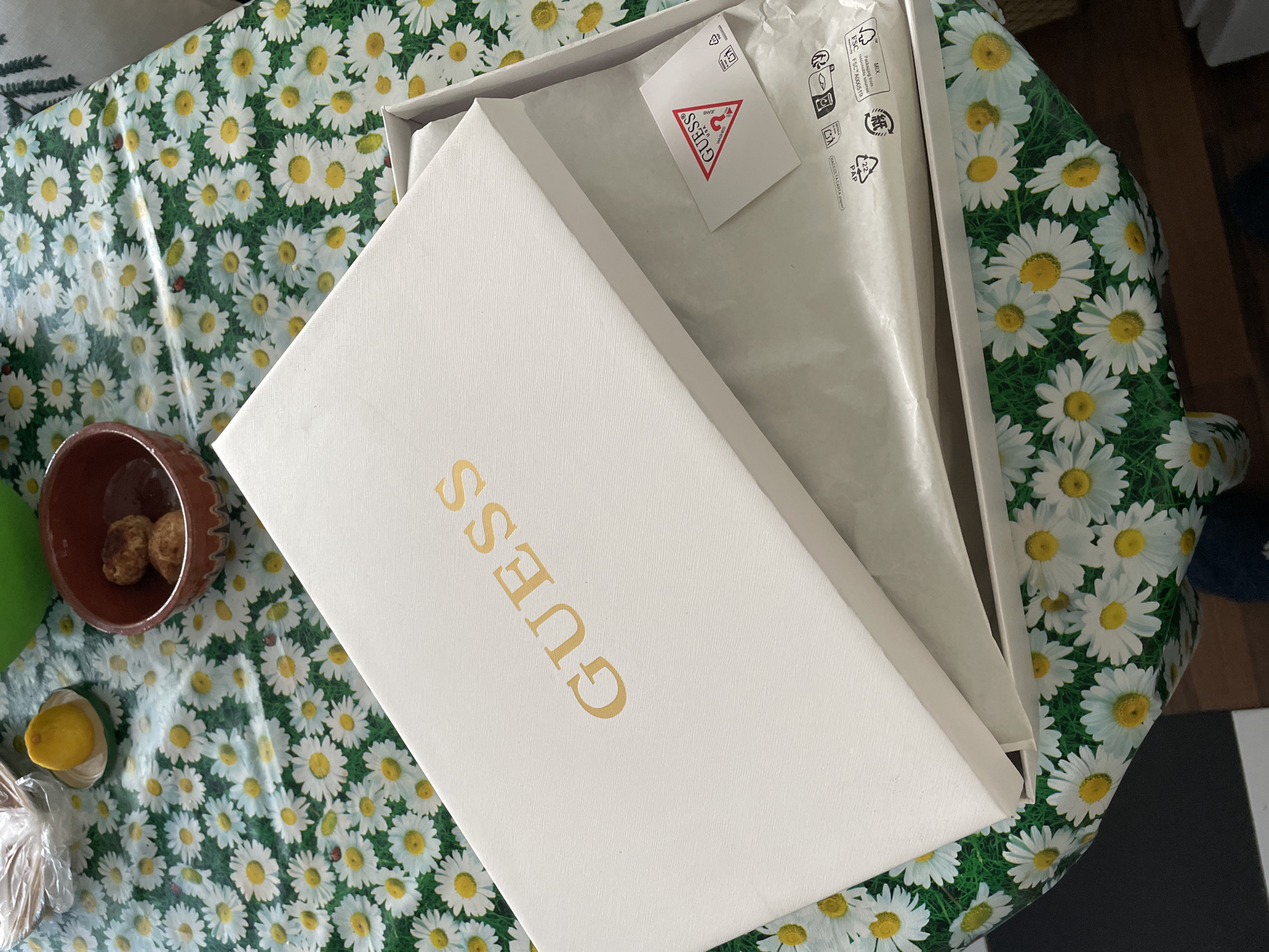 The scene presents a partially opened white Guess box on a tablecloth covered in a daisy pattern. Inside the box, a white tissue paper and a Guess tag are visible. Adjacent to the box, a small brown bowl contains what appears to be food items. A lemon and plastic wrap are near the bowl. The setting is indoors, and details suggest it could be a home. The photograph does not reveal the precise location in Stara Zagora, Bulgaria.