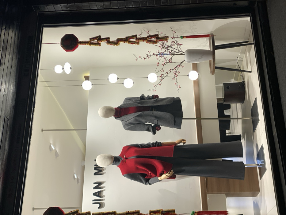 A brightly illuminated retail storefront display is observed at night in Linghe, China. The large glass window is framed by dark material. Inside, the interior features white walls and a white ceiling with recessed spotlights, and a light-colored floor. A horizontal light-toned wooden panel spans the lower section of the rear wall. Two headless, fabric-covered mannequins, exhibiting light beige skin tones and articulated wooden hands, are centrally positioned. The mannequin on the left wears a grey long-sleeved turtleneck, a red sleeveless vest with a single frog closure at the neckline, and wide-leg grey trousers. It is supported by a polished metallic square base with a vertical pole. The mannequin on the right wears a red long-sleeved turtleneck, a charcoal grey blazer with two front pockets and a visible black button, and charcoal grey shorts, accessorized with red gloves or wrist cuffs. This mannequin is also supported by a similar metallic base and pole. Above the mannequins, on the back wall, the brand name "JIAN MU" is displayed in large, dark, three-dimensional letters. Five white spherical pendant lights are suspended at varying heights on thin black cords towards the right side of the display. Two decorative strands, simulating strings of miniature firecrackers with alternating gold-wrapped cylindrical segments and red elements, terminating in red tassels, hang vertically from the ceiling near both the left and right edges of the window. In the lower right foreground, a white vase with subtle grey marbling, containing a branch adorned with numerous small red berries, rests on a small, dark wooden-topped round table with three dark legs. A dark, cylindrical object is visible on the floor behind the right mannequin.