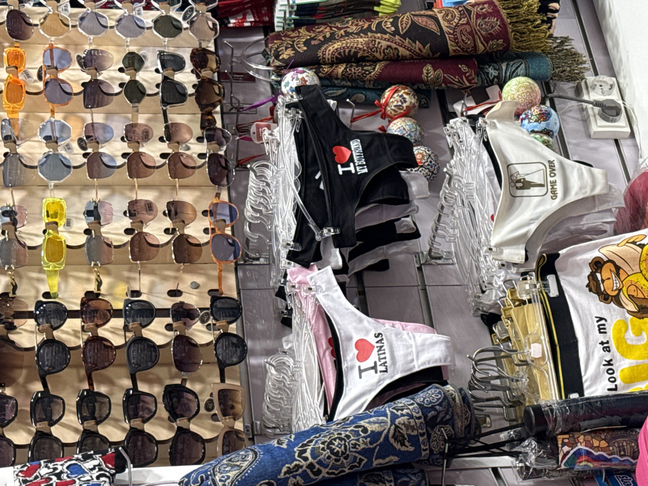This image depicts an interior retail display within a shop or market stall. The specific location in Barcelona, Spain, is not discernible from the visual information provided. **Scene Description:** The upper portion of the frame features a wooden-toned display wall, possibly slatted, showcasing approximately 50 pairs of sunglasses. These sunglasses exhibit a variety of frame styles, lens colors (including mirrored, gradient brown, yellow, orange, blue, and solid black), and shapes. Below the sunglasses, against a light grey wall, multiple horizontal metal rails hold clear plastic hangers. These hangers display numerous undergarments, predominantly thongs. Visible examples include: a white thong with "I ❤️ LATINAS" printed in red and black; a black thong with "I ❤️ MY BOYFRIEND" in red and white; and a white thong featuring a graphic of a bride and groom above "GAME OVER" text. Other plain pink and black undergarments are also present. Small, spherical, decorative ornaments, some patterned or glittered, are hung among these items. To the far left, a dark blue garment with a prominent patterned design is partially visible. Beneath the undergarments, a white t-shirt or similar item with a yellow graphic of a cartoon monkey eating a banana and partial text "Look at my BIG..." is displayed. A black umbrella is visible on the left, alongside other small, unidentifiable items in clear plastic packaging. On the right side of the frame, several patterned scarves or textiles in hues of maroon, blue, and brown, with fringed ends, hang vertically. In the lower right corner, a white European-standard electrical outlet is mounted on the wall. No individuals are present in the scene.