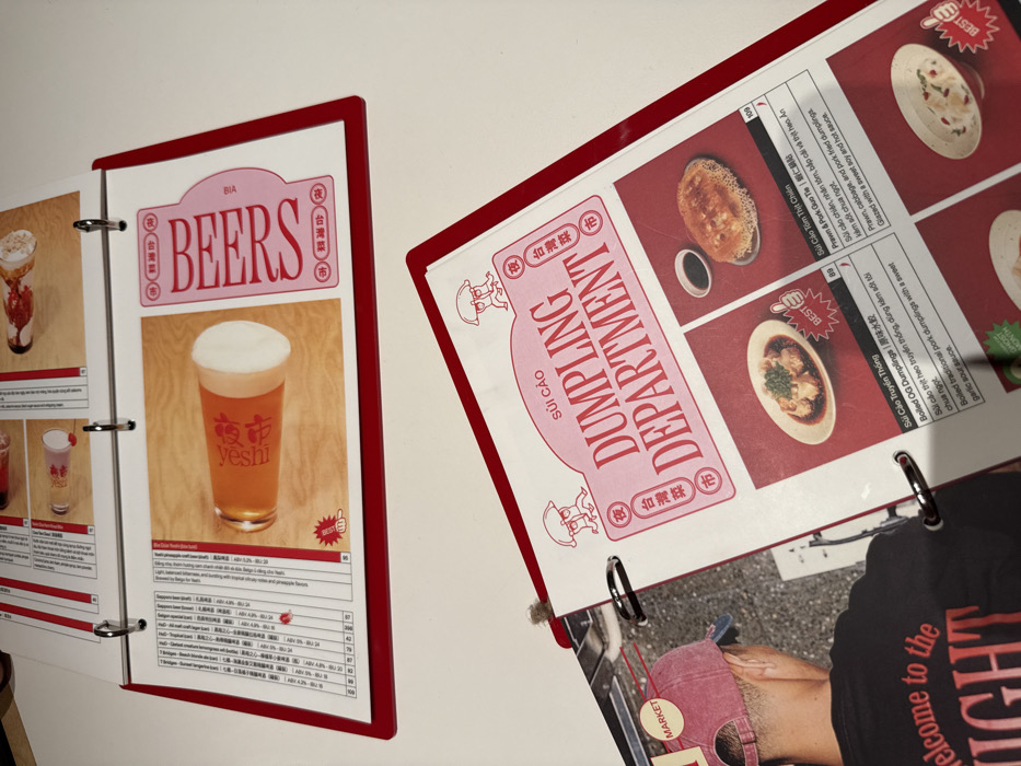 The image displays two open ring-bound menus with red covers on a white surface, consistent with a restaurant table in Thủ Đức, Vietnam. The upper menu is open to a "BEERS" section, featuring a large photograph of a glass of amber liquid with a white head and "yeshi" written vertically on its side. Below the image, a list of beverages with descriptions and prices is visible. The lower menu is open to a page titled "SUI CÁO DUMPLING DEPARTMENT," featuring images of various dumpling dishes. Specifically visible are "Sủi Cảo Truyền Thống" (Boiled OG Dumplings) and "Sủi Cảo Tôm Thịt Chiên" (Prawn & Pork Guotie), each accompanied by descriptions, prices, and a "BEST" rating icon. The page to the left within the lower menu shows a partial black and white image of a person's back, wearing a pink baseball cap and a dark t-shirt with the text "welcome to the NIGHT." A circular "MARKET" label is also partially visible above the person's head. No individuals are directly performing actions within the captured frame.