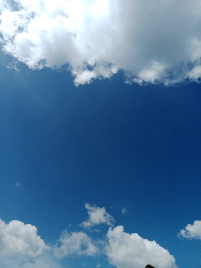 The scene, located in Nyeri, Kenya, displays a clear blue sky under daytime conditions. The upper portion of the frame is dominated by a continuous band of white and light grey cumulus clouds, extending horizontally across the sky. The central area features an expanse of unobstructed deep blue sky. Along the bottom edge, smaller, scattered white cumulus clouds are visible. A distinct green element, consistent with the top of a tree or foliage, is partially visible at the extreme lower right corner of the image. No individuals, man-made structures, specific actions, or interactions are discernible.