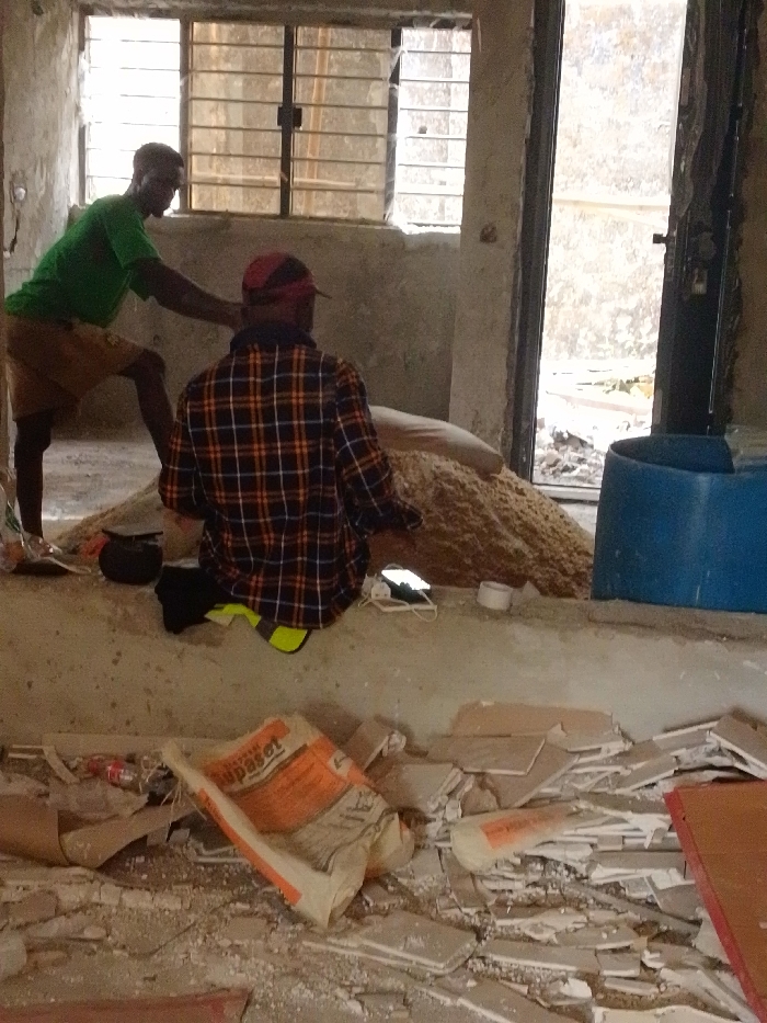 Inside a structure in Agukwu Nri, Nigeria, two adult males are present in an unfinished or disused concrete room with debris on the floor