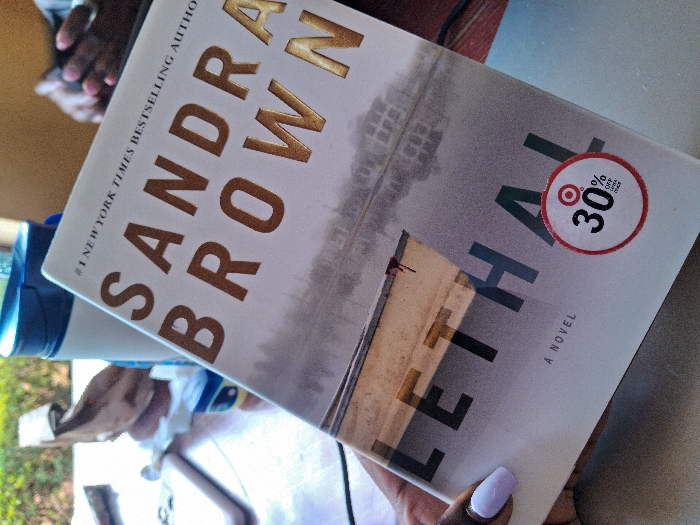 An image taken in Karingani ward, Kenya, depicts a first-person perspective of a novel being held over a light-colored table. The book, titled "LETHAL A NOVEL" by "SANDRA BROWN," features a cover showing a wooden boat with a reddish stain near its stern, afloat on dark water with a blurred background suggesting buildings or trees. A red and white circular Target sticker with "30% OFF REG PRICE" is affixed to the lower right corner of the cover. A dark-skinned hand, with a thumb displaying light purple nail polish, holds the book from the bottom edge. On the table to the left of the book, a white smartphone in a transparent case is visible, alongside an open brown paper bag, a crumpled white tissue, and a small blue and white Vaseline jar. Behind the book, a tall white and blue bottle with a flip-top lid is present. In the upper right background, another person's hands, with pink-polished fingernails, are visible holding a dark-colored smartphone or similar device, appearing to interact with it. The background further reveals a blurred view of green foliage, suggesting an outdoor environment or plants visible through a window.