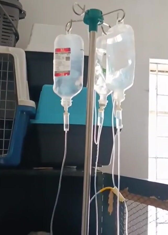 three intravenous fluid bags hanging from a stand. The fluid drips through clear tubing. The camera pans down to a small white cat sitting inside a dark cage. It has an IV line connected to its leg. The environment appears to be a veterinary clinic.