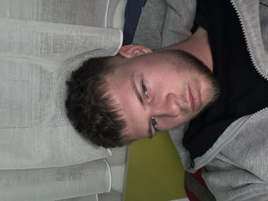 An image displays a single male individual in a close-up, chest-up portrait format. The subject is a light-skinned male, appearing to be in his 20s or 30s, with short, textured dark brown hair featuring a faded undercut and a short fringe. He has light blue eyes and light stubble on his jawline and chin. He is wearing a light grey zip-up hoodie, partially unzipped, over a black t-shirt. The individual maintains a direct gaze towards the camera with a serious or neutral expression. The background indicates an indoor setting. To the subject's upper right, white, sheer, textured curtains are visible. A section of a solid yellow wall is present behind the subject's left side. Directly behind the subject's right side, a dark blue fabric or surface is discernible beneath the curtains. On the lower left, behind the subject's shoulder, a patterned object, possibly a blanket or cushion, with diagonal stripes in red and beige tones is visible. The lighting appears artificial. The specific location within the city of Dospat, Bulgaria, cannot be determined from the visual information provided in the image.