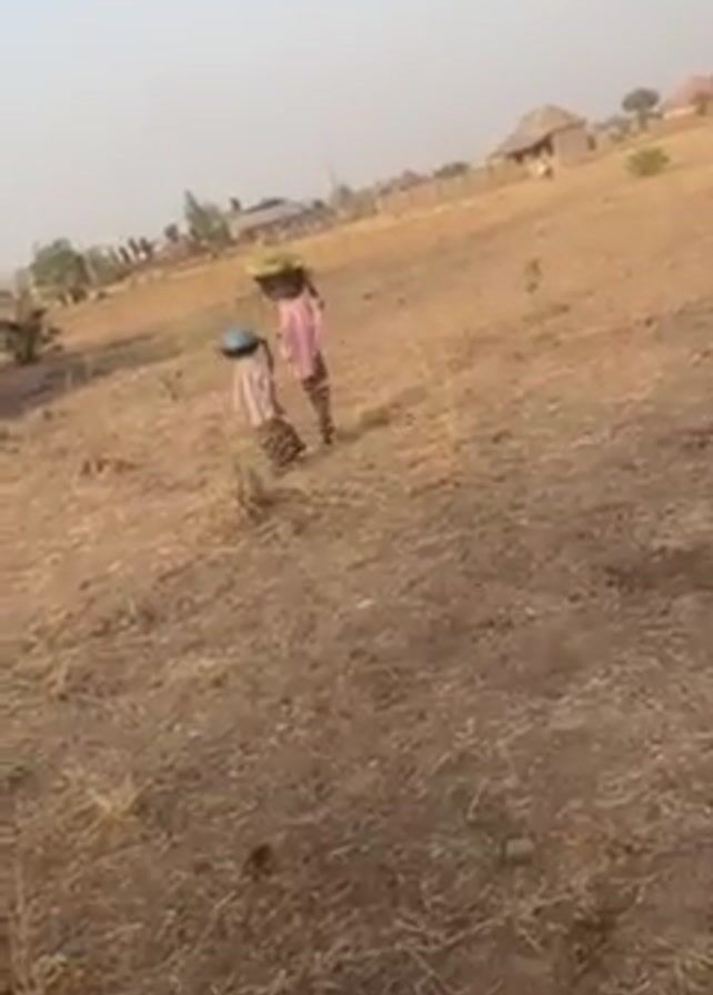 dry, grassy field in a rural area. Two figures are walking away from the camera, carrying items on their heads. The first figure is wearing a pink top and patterned skirt. The second figure, seemingly smaller, is wearing a light-colored top and carrying a blue object on their head. In the distance, there are several simple buildings and a few trees. Several children run and play in the field, with some kicking an object that is out of focus. The overall tone of the video appears to capture a scene of everyday life in a rural setting.