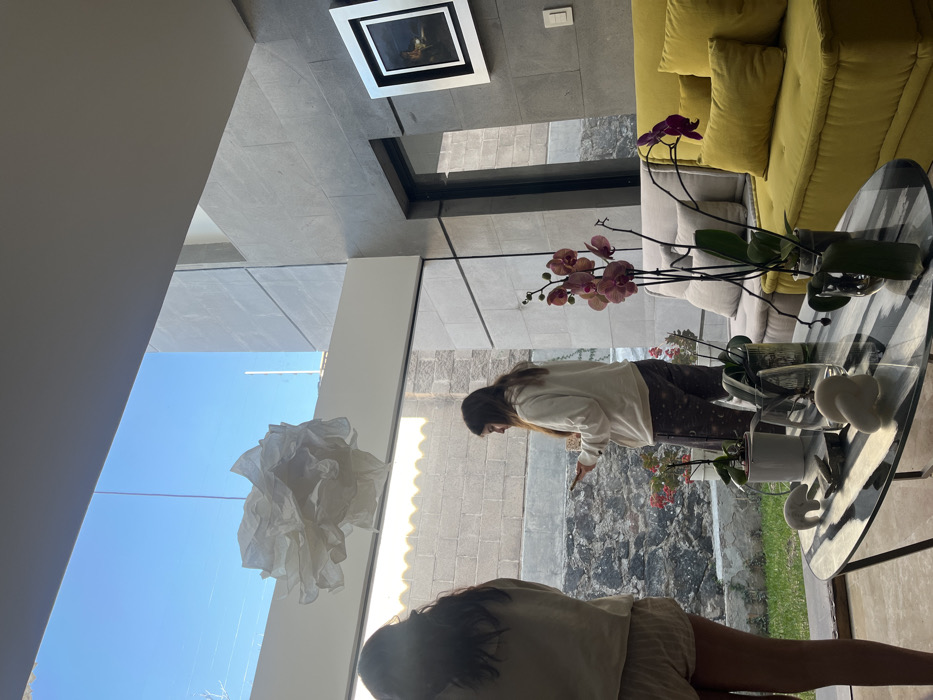 The image depicts an interior scene, likely a living room, within the city of Tlaxcalancingo, Mexico, characterized by modern architecture and furnishings. Two individuals are present, positioned near a large window offering a view to the outside. On the left, partially cropped, a person with long dark hair is seen from the back, wearing a light-colored top and light-striped shorts, facing towards the window. To the right of this individual, a second person, also with long dark hair, stands facing left in profile, wearing a light-colored hooded sweatshirt and dark patterned pants. This person is actively engaged with a smartphone, holding it in both hands and looking down at its screen. The interior features a clean, contemporary design. A white, ruffled paper lantern hangs from the ceiling in the upper center. A rectangular coffee table with a reflective, striped glass top occupies the foreground, displaying various decorative items including small white ceramic figures, a potted plant, and clear glass objects. Behind the coffee table and to the right, a vibrant yellow modular sofa with plush cushions is visible. Further back, a light gray modular sofa is situated. The interior walls are clad in large, rectangular gray tiles, and a framed piece of artwork with a silver frame, depicting a dark landscape or scene, is mounted on the far right wall. A tall orchid plant with several pink/purple blooms stands upright in a pot on the coffee table, with another potted orchid visible nearby. Through the expansive window, an outdoor area is visible under a clear, bright blue sky. The immediate exterior includes a textured stone or concrete wall with some red flowering plants and green foliage at its base, along with a patch of green grass. In the distance, a modern building with gray-toned exterior walls is discernable against the sky.