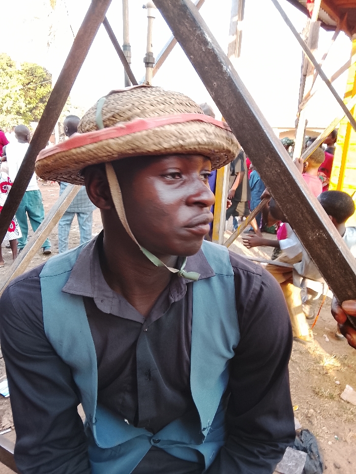 An outdoor scene in Akwanga, Nigeria, features a young adult male of dark complexion, captured in a medium-close shot. He wears a wide-brimmed, woven straw hat with a red band and a light-colored chin strap secured under his chin. His skin exhibits a glossy sheen. He is dressed in a dark, long-sleeved collared shirt and a light blue sleeveless vest worn over it. The subject is oriented looking towards the right side of the frame, maintaining a neutral expression. The background reveals a structural framework composed of rough wooden beams, with a vertical beam and an attached pipe visible behind the subject's head. Multiple blurred figures are present in the background, including an individual in a white top and green trousers on the left, and a figure, possibly a child, seated on the bare earth to the right. The ground is comprised of exposed dirt. The scene is illuminated by bright natural light, originating from the right.