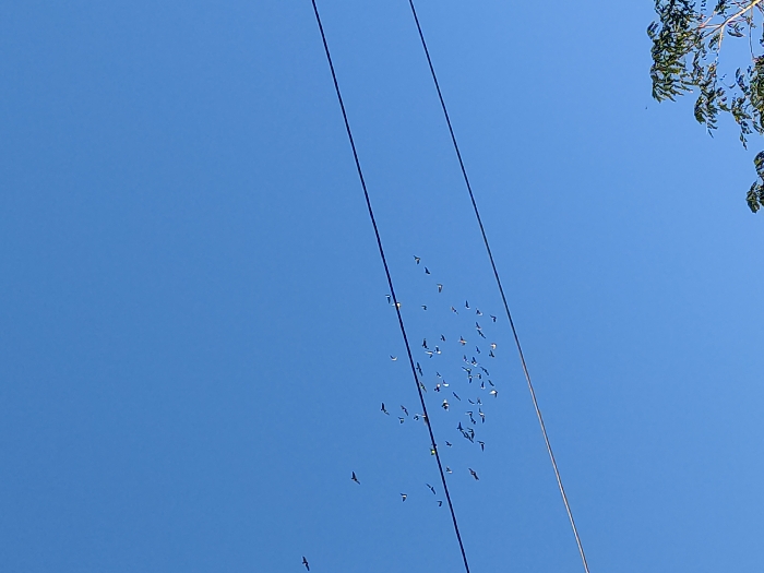 A flock of birds is visible in flight against a clear blue sky. Two power lines run diagonally across the image. Leaves of a tree are in the upper right corner. The birds appear to be flying near or between the power lines. The light is bright and the sky is clear, suggesting a sunny day.