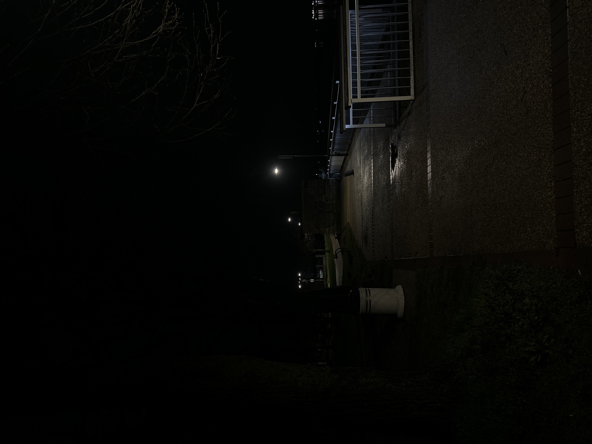 The image depicts a nighttime scene along a pedestrian walkway in what is presumed to be Silistra, Bulgaria, based on the request context. The walkway is illuminated by distant streetlights. A metal railing is visible on one side of the walkway. A cylindrical trash receptacle is present. Vegetation is visible in the lower foreground. The left side of the image is dominated by deep shadow.