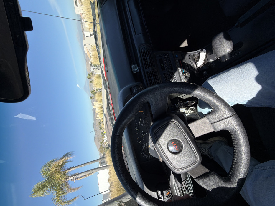 A view from the driver's seat showcases a vintage car's interior. The black leather-wrapped steering wheel with a prominent Chevrolet logo dominates the frame. A glimpse of the dashboard, gear shift, and the driver's leg in jeans is visible. Outside, a bright blue sky stretches above a desert landscape with palm trees and distant mountains. The sun casts long shadows inside the vehicle.