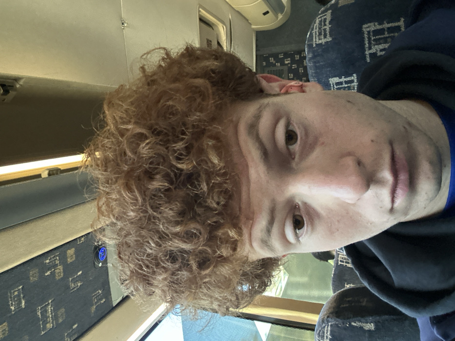 - "A young adult male, with voluminous reddish-brown curly hair and light skin, is depicted in a close-up selfie taken inside a bus or coach in Richmond, United States" by FM-ja7R73, licensed under CC BY 4.0