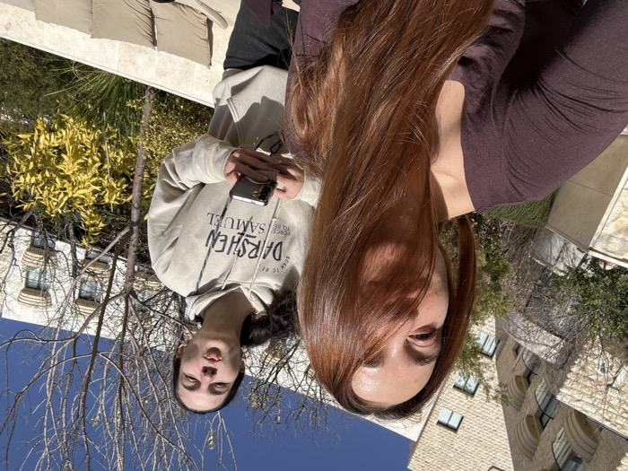 The image captures two young adult females outdoors on a sunny day, likely on a terrace or garden patio. The background features multi-story buildings constructed of light-colored stone, characterized by multiple windows and distinctive, curved balconies. This architecture is consistent with the Ruth Zefat hotel in Safed, Israel. In the foreground, a female subject with reddish-brown hair, which partially obscures her left eye and nose, looks towards the camera. She wears a dark purple long-sleeved top. In the mid-ground, a second female subject with dark hair pulled back into a ponytail is positioned slightly behind and to the right of the first. She is making a puckering expression with her lips and holds a dark-cased smartphone in her hands. She wears a light-colored hooded sweatshirt bearing the text "BORN TO BE DARSHEN FORCE TO BE SAMUEL". The environment includes several trees, some deciduous with bare branches, and others with green foliage. A bright yellow-leafed bush is visible behind the second subject. A clear blue sky is visible above the buildings. Part of an outdoor lounge sofa with light-colored cushions is visible in the lower right corner, resting on a light-colored stone or concrete surface. Strong sunlight illuminates the scene, casting shadows on the first subject's face.