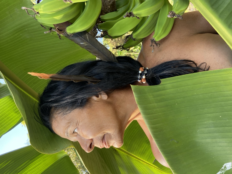 An outdoor, eye-level medium shot in Los Velásquez, Venezuela, depicts an adult individual with dark hair and tan skin in profile, looking towards the upper left. The individual's dark hair is pulled back, secured with two beaded hair ties: one black and white, the other featuring orange-brown and white beads. Two feathers are tucked into the hair; a smaller, reddish-brown feather is near the forehead, and a larger, darker feather extends from the back of the head towards the right. The individual's bare shoulder is visible. Lush, green banana leaves dominate the foreground and background, framing the subject. A large bunch of unripe, green bananas hangs on a stalk to the right of the individual. The background reveals blurred foliage and a bright blue sky, indicating natural light conditions.
