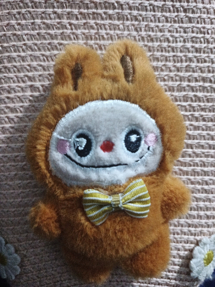 A light brown, plush toy is centered on a light pink, horizontally ribbed textile surface in the city of Unknown, Unknown. The toy, approximately 15 cm tall, features a beige circular face framed by its furry brown body, which forms two prominent ears with darker inner segments. Its face displays large, black, oval eyes with white highlights, a small red circular nose, a stitched black smile, and two pink blush marks on the cheeks. A yellow and white striped bow tie is attached below the face. In the lower left and right corners, partial views of white, daisy-shaped decorative elements with yellow centers are visible against the textured background. No people are present, and no active interactions are depicted in this static scene.