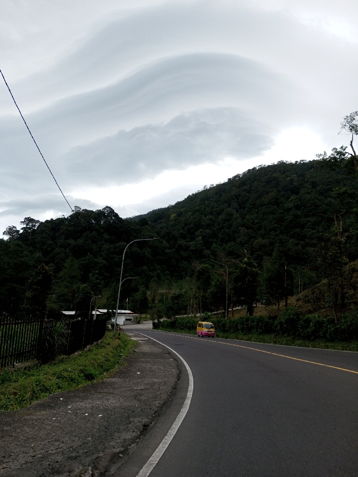 The scene depicts a curved asphalt road traversing a hilly, forested landscape in Adhanur, India, under an overcast sky. The upper sky is dominated by a distinctive, layered wave-like cloud formation. A dark green, densely forested mountain or hill rises steeply on the right and central background. In the foreground, a dark grey asphalt road curves from the lower left towards the mid-right. It features a solid white line marking the outer edge on the left and a solid yellow line separating lanes. A concrete curb abuts the road on the left, followed by a strip of green grass and a dark metal fence. Behind the fence and roadside foliage, a light-colored building with a red detail is partially visible. Two streetlights with curved arms stand along the left side of the road. A yellow van with a pink front bumper is positioned on the right side of the road, facing away from the viewer, near the curve. A single black power line extends diagonally from the upper left. No individuals are present in the visible area.