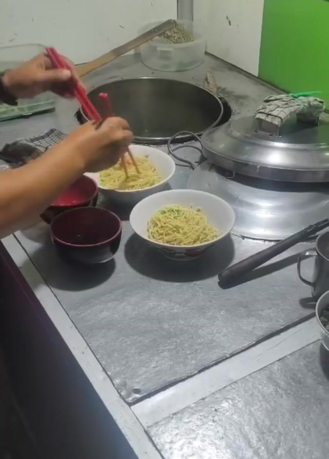 A person is preparing two bowls of noodles at a food stall. The person, whose forearms are visible, uses red chopsticks to transfer noodles from a larger bowl into two smaller, white bowls. Two red bowls sit to the side. To the right, there's a large metal pot with a lid and various utensils. The counter is a grey, tiled surface. The background includes a white wall with a green trim.