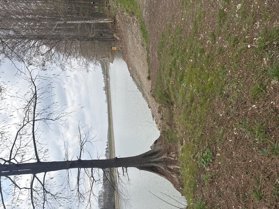 The image displays an outdoor landscape in Nikolovo, Bulgaria, under an overcast sky, suggesting late winter or early spring conditions. A calm, greyish-green body of water, likely a lake or reservoir, occupies the central and left-midground. In the left foreground, a prominent deciduous tree stands with a thick, dark, buttressed trunk and visible root flare, rising from a grassy bank. Its branches are bare, adorned with numerous small, pendulous catkins. The ground immediately around this tree and extending into the lower left consists of a mix of brown earth, sparse green grass, and organic debris. Along the right side of the frame, a well-defined dirt path runs parallel to the water's edge, positioned on a slight incline above the water. The shoreline directly adjacent to the path consists of bare, muddy earth and scattered small stones. Further right, a dense stand of tall, bare deciduous trees forms a vertical line, with one tree notable for its lighter-colored bark. A small, square yellow sign featuring the number "20" in black text is affixed to one of these trees near the water. Across the water, in the distant background, a low, earthen embankment is visible, behind which a cluster of buildings with reddish-brown rooftops indicates a distant settlement or village. No individuals, animals, or active vehicles are present in the scene.
