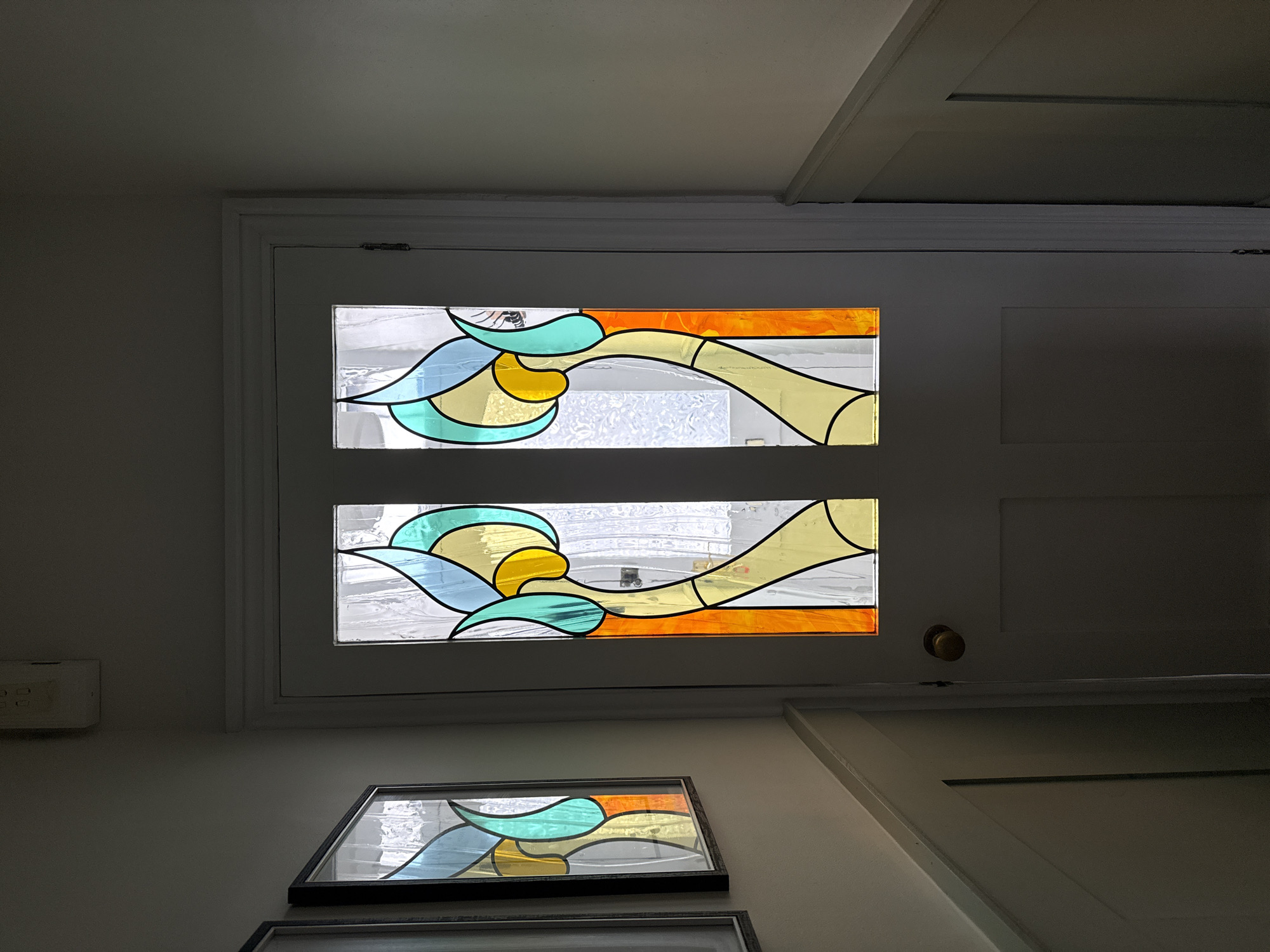The image presents an interior hallway in Windermere, United Kingdom. A closed white wooden door, featuring two vertical stained-glass panels, occupies the center-right of the frame. Each stained-glass panel displays an abstract, organic design comprised of yellow, orange, light blue/turquoise, and clear textured glass segments, outlined by dark leading, with the design appearing largely symmetrical between the two panels. A brass-colored circular doorknob is situated on the left side of the door. The right side of the door shows a silver-colored hinge. To the left of the door, a light-colored wall with white wainscoting extends into the foreground. Two dark-framed rectangular objects, appearing to be mirrors or art pieces, are mounted on this wall, reflecting elements of the stained-glass design. The ceiling is light-colored, and a white rectangular fixture, possibly a smoke detector or alarm component, is visible mounted on the ceiling in the upper-left corner of the frame. Light enters the hallway primarily through the stained-glass panels, illuminating them brightly, while the hallway itself appears to be in comparative shadow. No individuals, actions, or interactions are present in the scene.