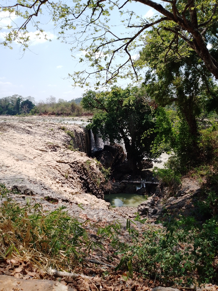 The image depicts a natural landscape featuring a waterfall and rocky riverbed under a clear, bright sky in Đức Lập, Vietnam. The upper portion of the frame shows sparse tree branches with light green leaves extending into a pale blue sky. The foreground consists of dry, rocky ground covered with patches of brown leaves and some green, grass-like vegetation. This rocky terrain descends sharply into a gorge, revealing dark, columnar basalt formations. A waterfall cascades over these dark rock formations into a tranquil, greenish-brown pool of water below. Across this pool, a small, dark-colored pedestrian bridge, possibly made of wood or metal, connects two rocky banks. Dense green foliage and large trees with full canopies flank the waterfall and pool, primarily on the right side of the image. Beyond the immediate water feature, the landscape extends into a wide, flat expanse of light-colored, rocky ground, suggesting a riverbed, followed by a distant treeline and hazy hills on the horizon. No individuals or specific activities are discernible within the scene. The lighting indicates a sunny day.