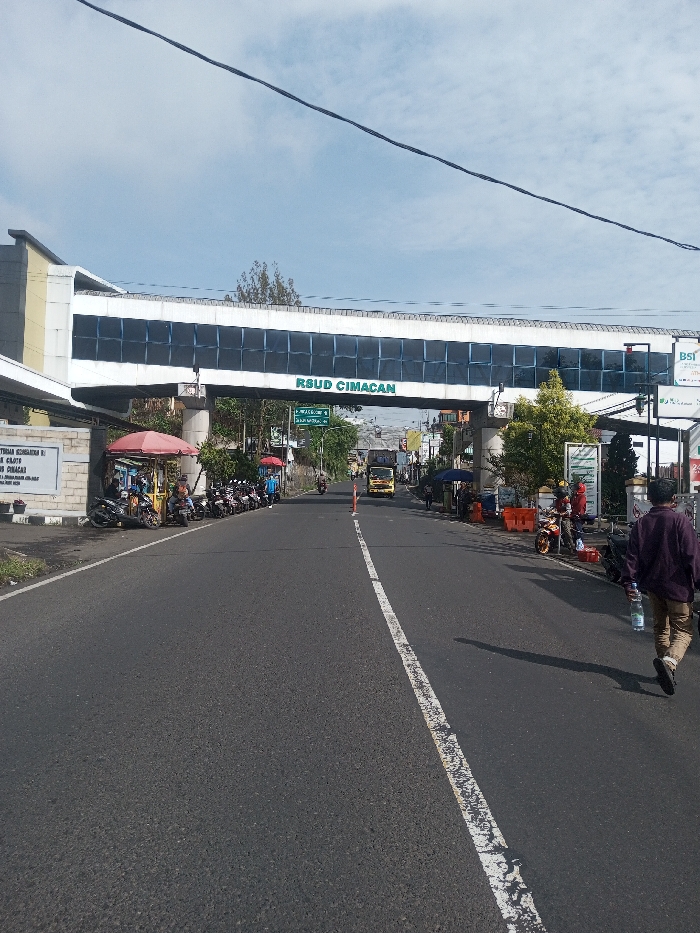 The scene is set in the city of Thanthirimale, Sri Lanka, depicting a wide, asphalt road under a partly cloudy blue sky. A prominent white and dark-paneled pedestrian bridge, labeled "RSUD CIMACAN" in green text, spans across the road. Below the bridge, on the left side, numerous motorcycles are parked in a row near several street vendors operating under red and blue parasols. Multiple individuals are visible near these vendors and parked motorcycles, some standing, some obscured. A light-colored building wall with text is partially visible behind the vendors on the left. On the right side of the road, a pedestrian wearing a dark top and light trousers walks away from the camera, carrying a clear water bottle. Further down this side, additional vendors are present, along with more parked motorcycles and a yellow traffic cone. In the distance, a yellow truck or bus is visible traveling on the road. Green foliage and trees are scattered throughout the background on both sides of the road. Shadows indicate bright daylight conditions.